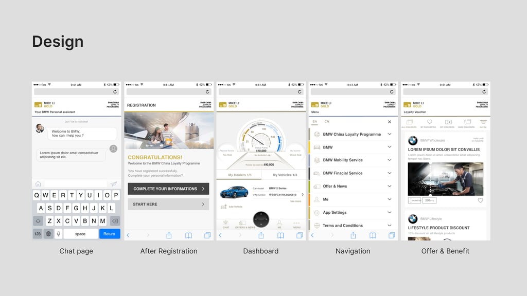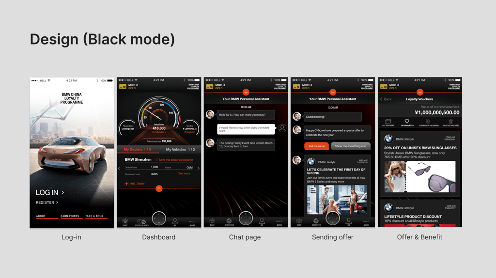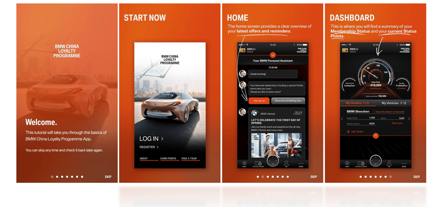 Create an App for BMW car owners. The level of experience of the consumer gets reflected out of the BMW Group world. The differentiators (futuristic, innovative, premium, responsible) are the main criteria for the tonality, activities and experience of the Loyalty Programme.
